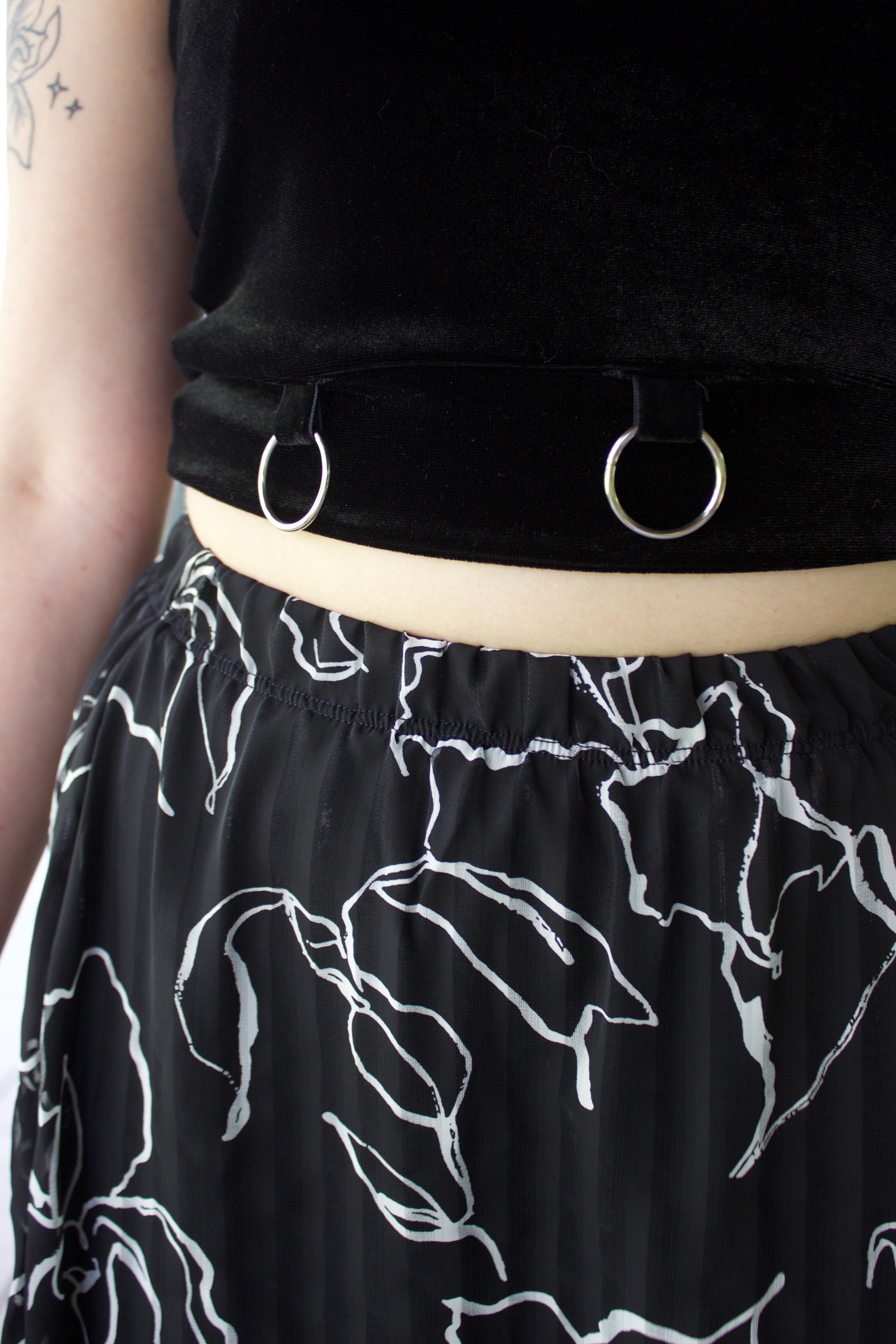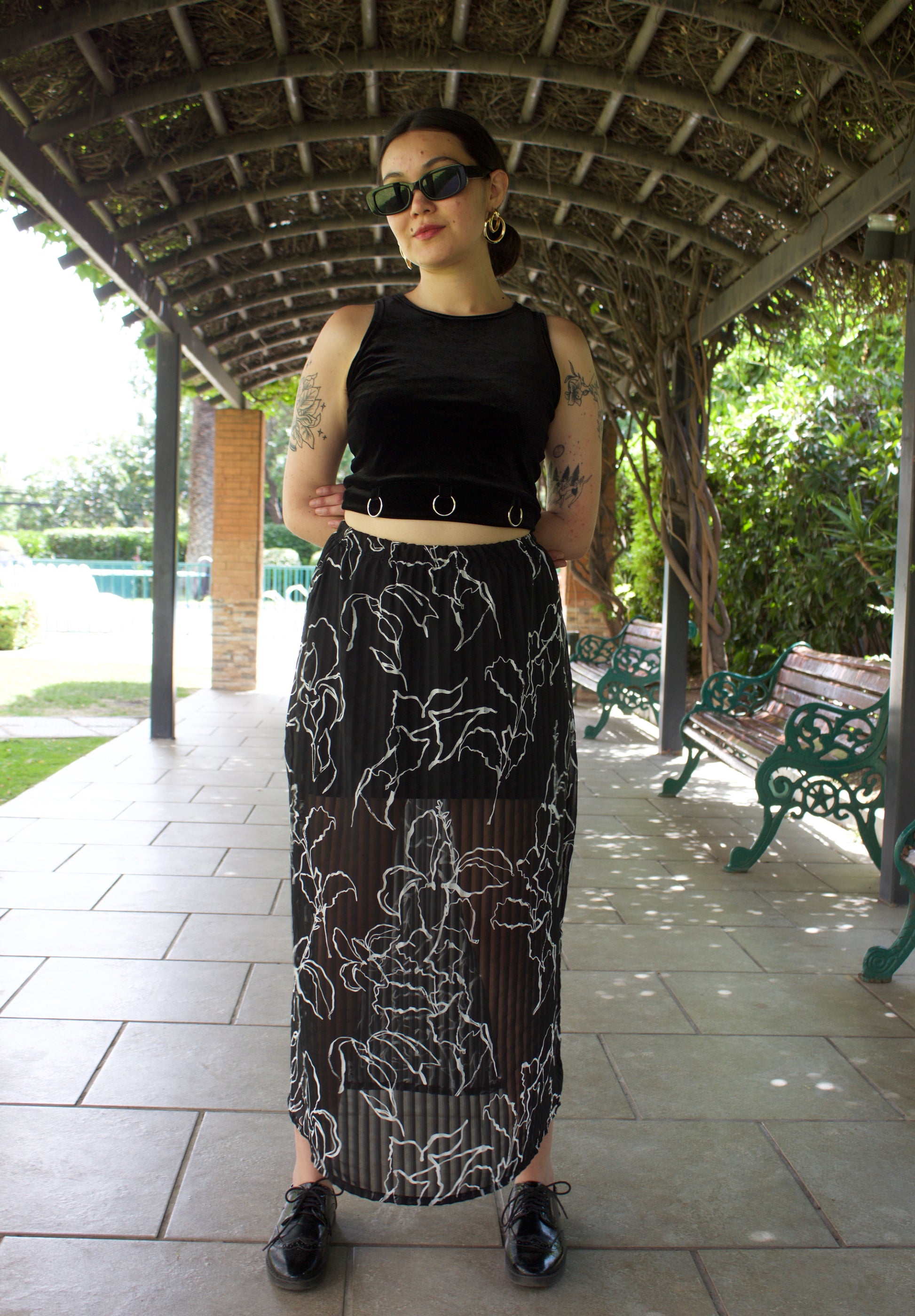 Falda gasa transparente floreada, incluye falda de forro y pretina con elástico.