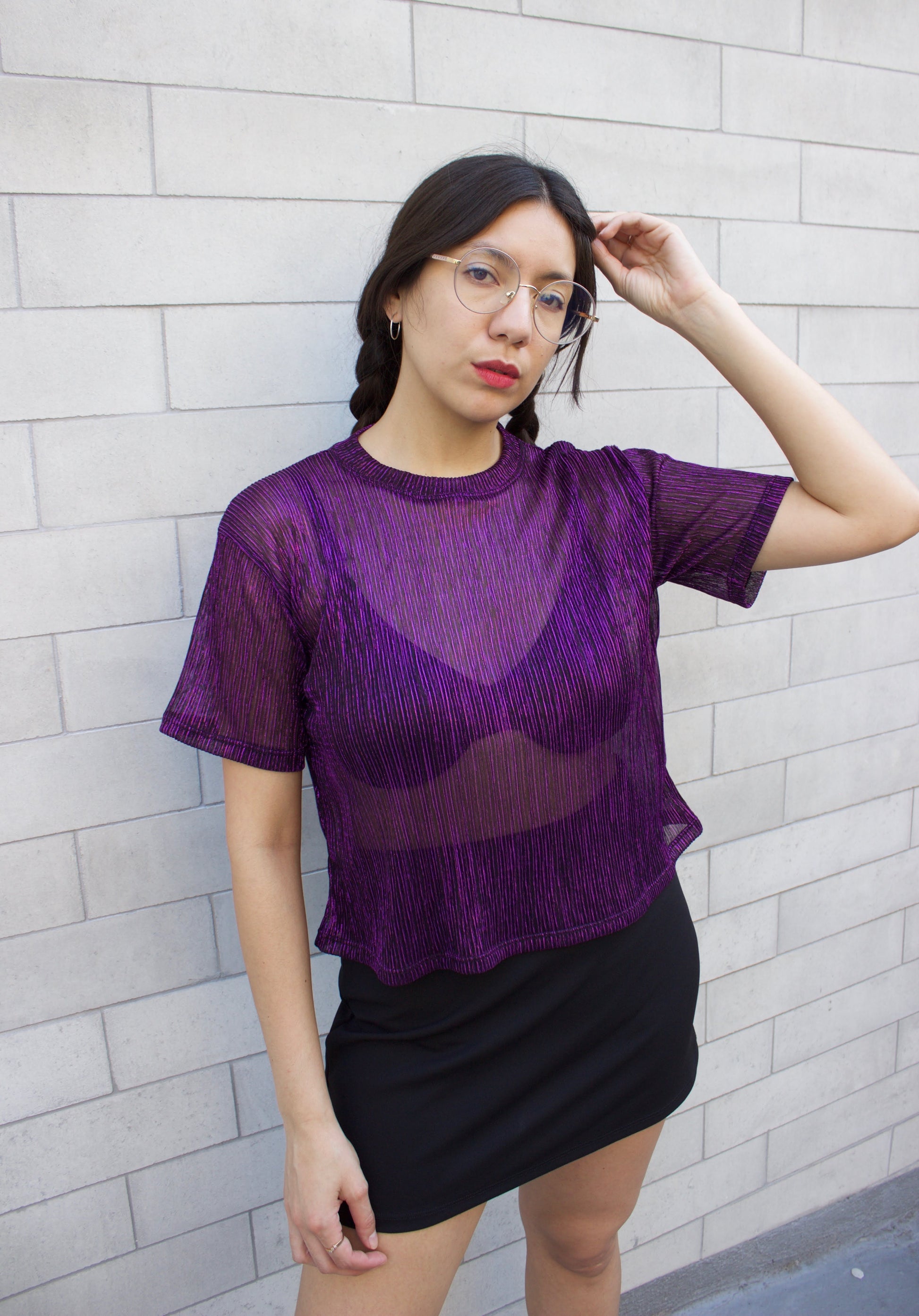 Polera plisada transparente morada brillante, tipo oversize, manga corta.