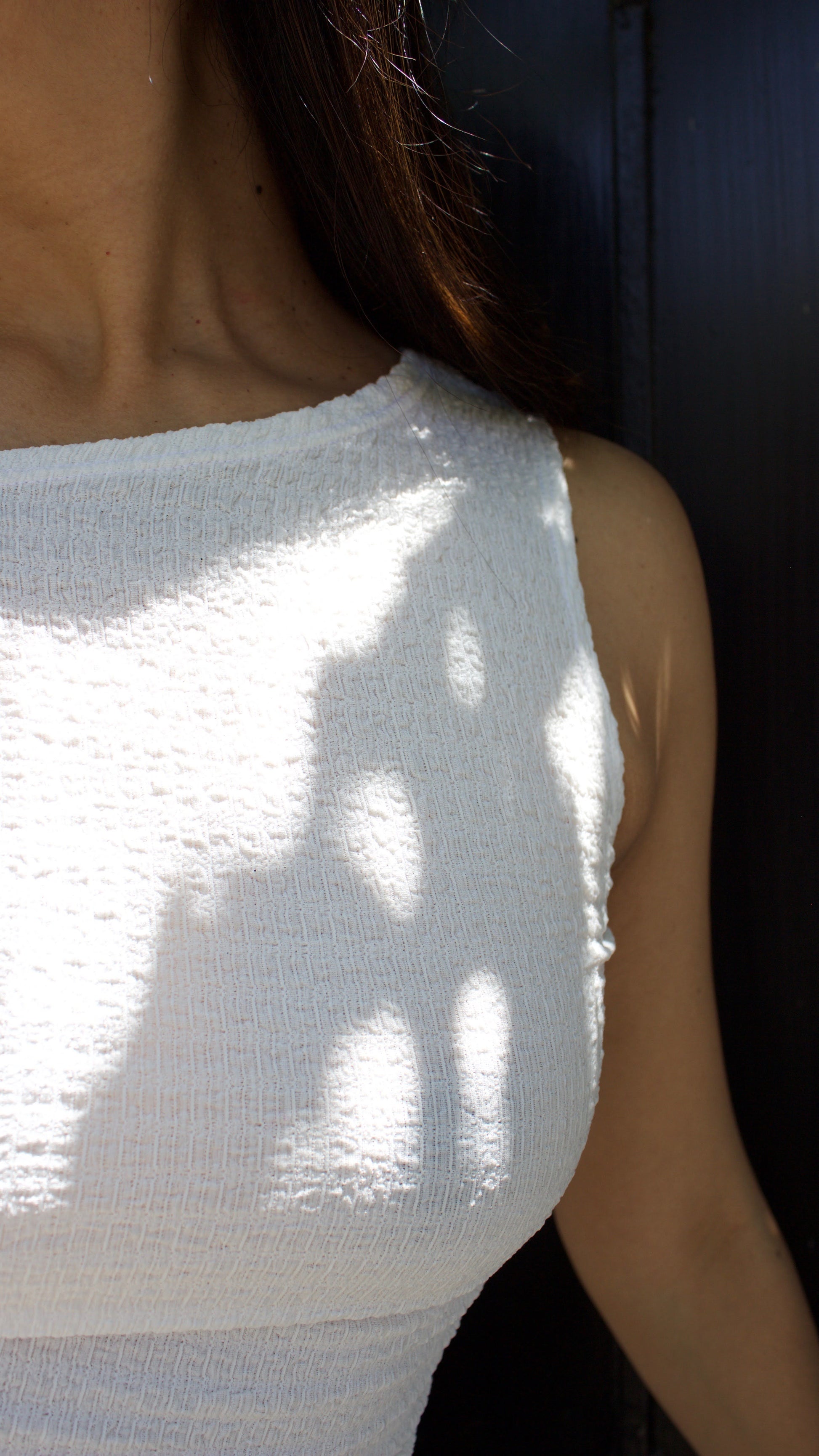 Tela texturizada con efecto acanalado/arrugado, de tacto suave y elasticidad media. Ideal para prendas que buscan calce firme pero cómodo.