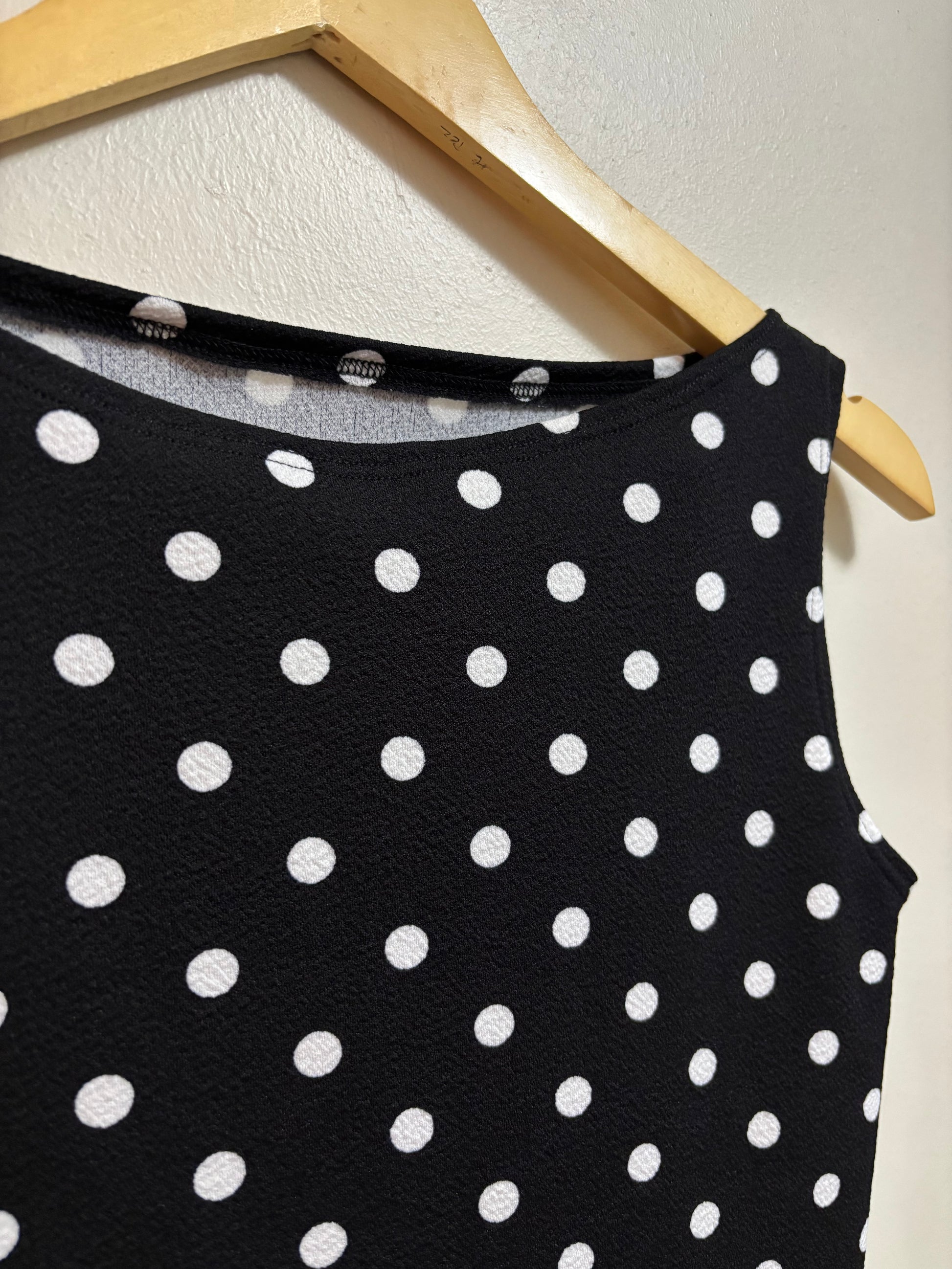 Top entallado en tela Sofía elasticada de grosor medio, con escote barco que realza los hombros. Diseño en negro con lunares blancos, cómodo y versátil.