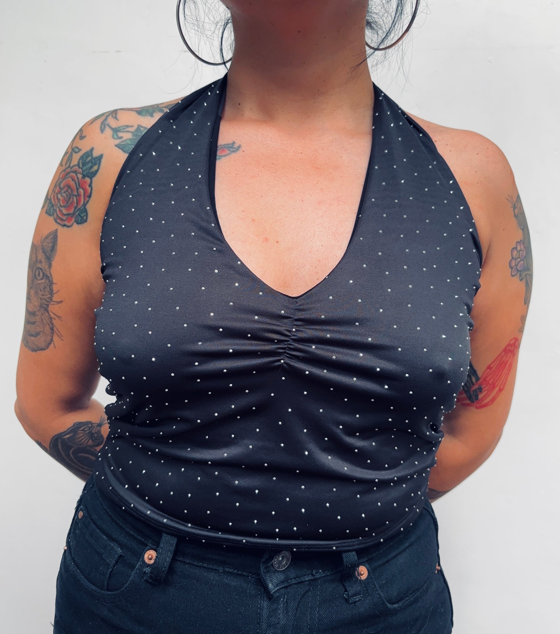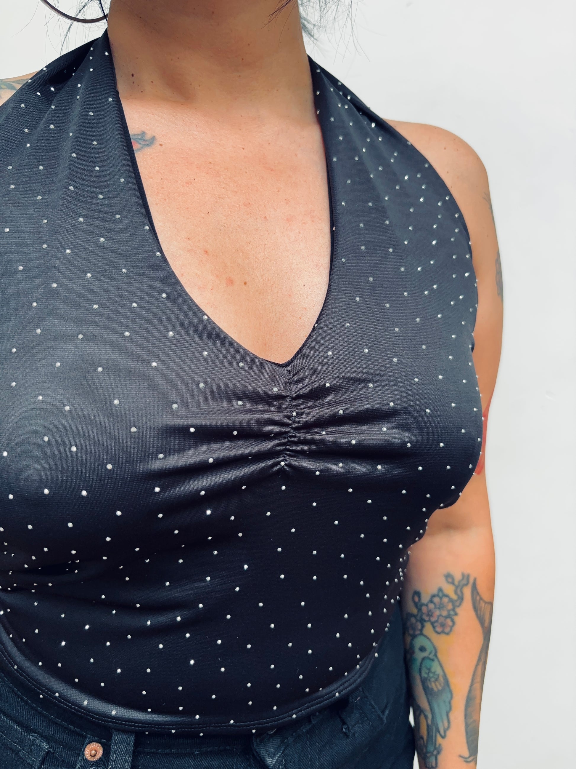 Crop top tela lycra fría negra con tachas, elasticada. Se amarra atrás en la parte del cuello, tiene un fruncido en el escote.