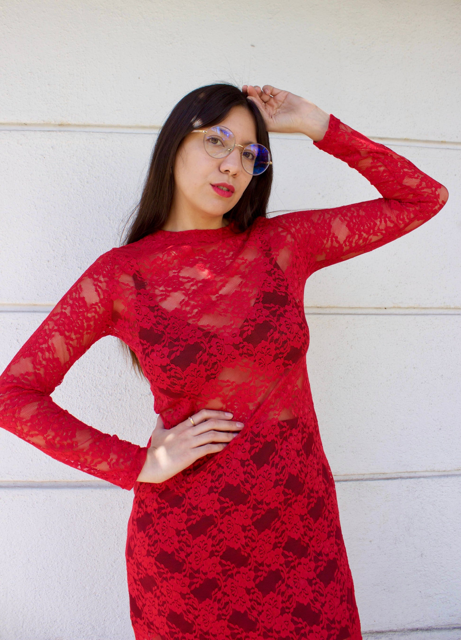 VESTIDO MIDI ENCAJE ELASTICADO ROJO, MANGA LARGA